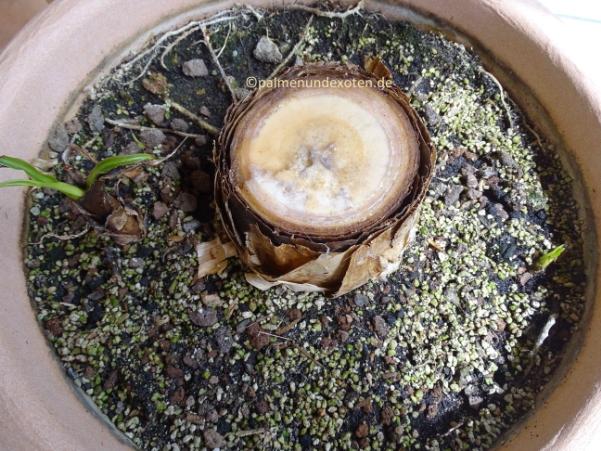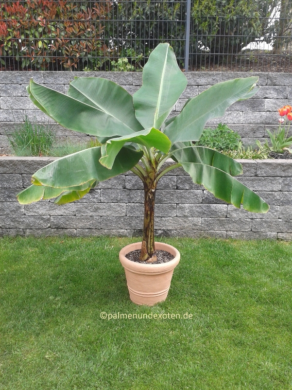 26.04.2015: Nur für das Foto habe ich sie rausgestellt. Sonst steht sie weiterhin das ganze Jahr im Haus. Gedüngt wird sie mit Palmendünger, der aber für Bananenstauden und andere Grünpflanzen auch sehr gut geeignet ist.