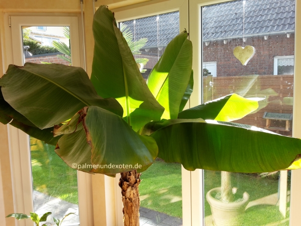 Oktober 2015: Die Musa dwarf cavendish ist jetzt 1,6m hoch. Der Scheinstamm hat eine höhe von 90cm und einen durchmesser von 12cm. Sie ist innerhalb von einem Jahr nur 30cm gewachsen, obwohl sie sehr viele Blätter bekommen hat.