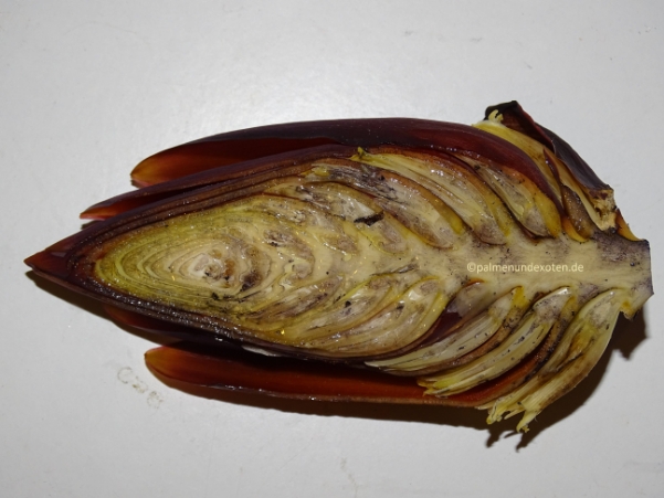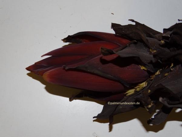 02.02.2017: Die Bananen sind in den letzten 2 Monaten nur ein klein wenig dicker geworden und einige männliche Blüten haben sich geöffnet. Die Blüte habe ich heute abgeschnitten. Die Bananen sollen dadurch schneller ausreifen da ganze Kraft nun in die Früchte geht.