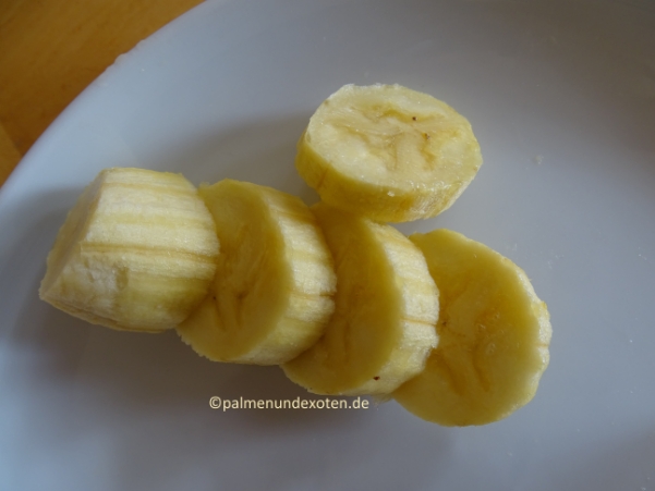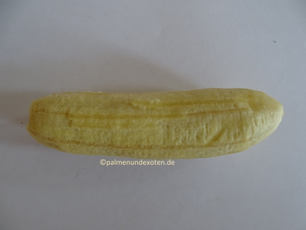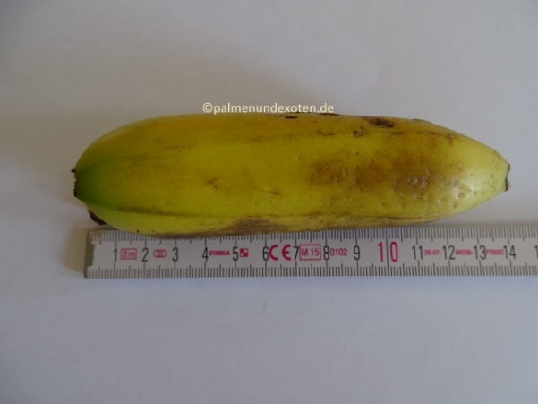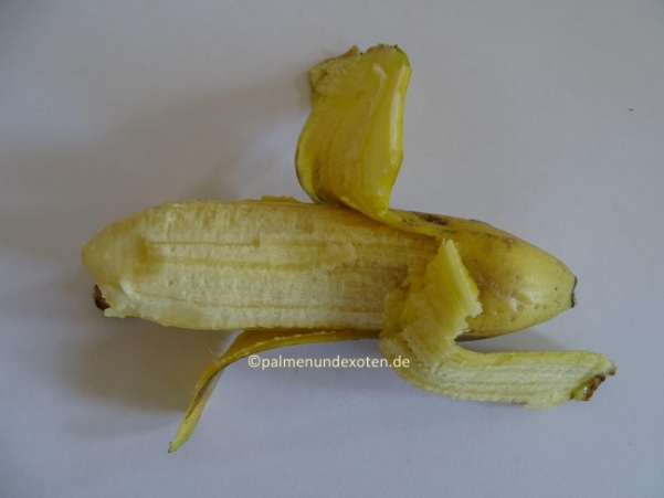 Die gestern geerntete Banane ist jetzt komplett gelb. Sie wurde vor ca. 30 Stunden von der Staude getrennt. Die Schale ist sehr dünn. Die Banane ist süß und der Geschmack ist sehr intensiv. Super lecker!!! Insgesamt sind es 1,7Kg.