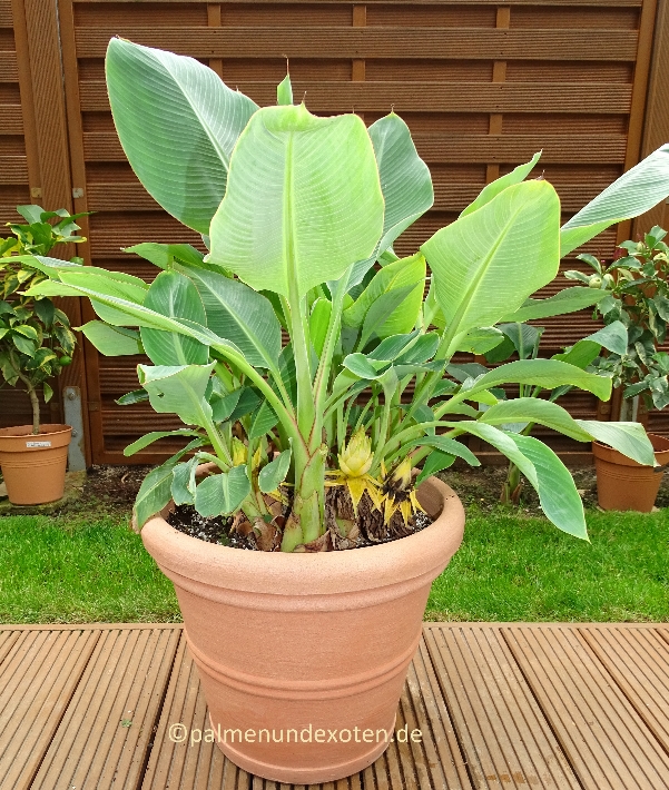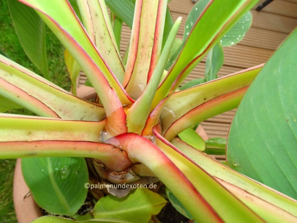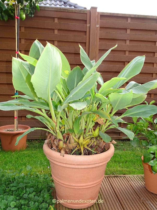 08.10.2016: Die Lotus Banane wächst wie die meisten Bananen relativ schnell und bekommt auch schon früh Ableger. Sie ist jetzt 35cm hoch bei einer Scheinstammhöhe von 10cm. Den ersten Winter werde ich sie bei ca. 18°C überwintern.