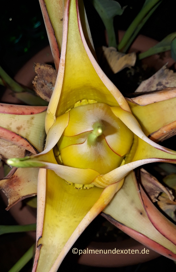 07.10.2018: Eine Blüte kündigt sich an. Man erkennt es zuerst an den kleineren Blättern. Dadurch ist sie auch nur noch 70cm hoch. Der Scheinstamm hat einen Durchmesser von 13 cm.