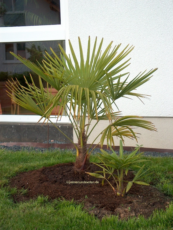 17.05.2009: Die linke Trachycarpus fortunei hat eine größe von ca. 70-80cm und die rechte ca. 25-30cm. Beide habe ich im April 2009 ausgepflanzt. Der Standort ist an der Süd-Westecke des Hauses. Die Palmen bekommen fast den ganzen Tag Sonne ab. Das Pflanzloch habe ich großzügig ausgehoben, und den Boden mit Sand und Grünpflanzenerde verbessert. Die kleine Trachy habe ich vor 3 Jahren selber ausgesäht.