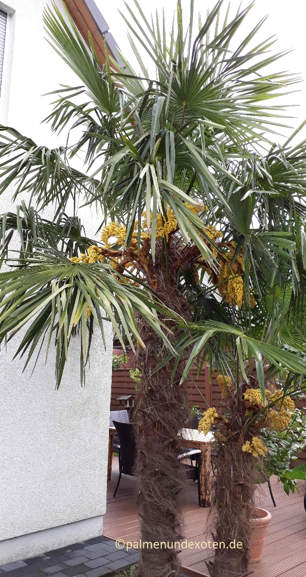 19.05.2019: Die kleine Trachy hat ihre erste Blüte bekommen. Sie ist auch männlich. Auf dem Bild kann man gut erkennen wie die kleine Palme sich von der großen wegneigt.