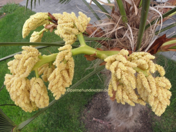 13.05.2013: Die Trachycarpus wagnerianus blüht zum ersten mal. Die Spitzen der Blüten haben frostschäden.